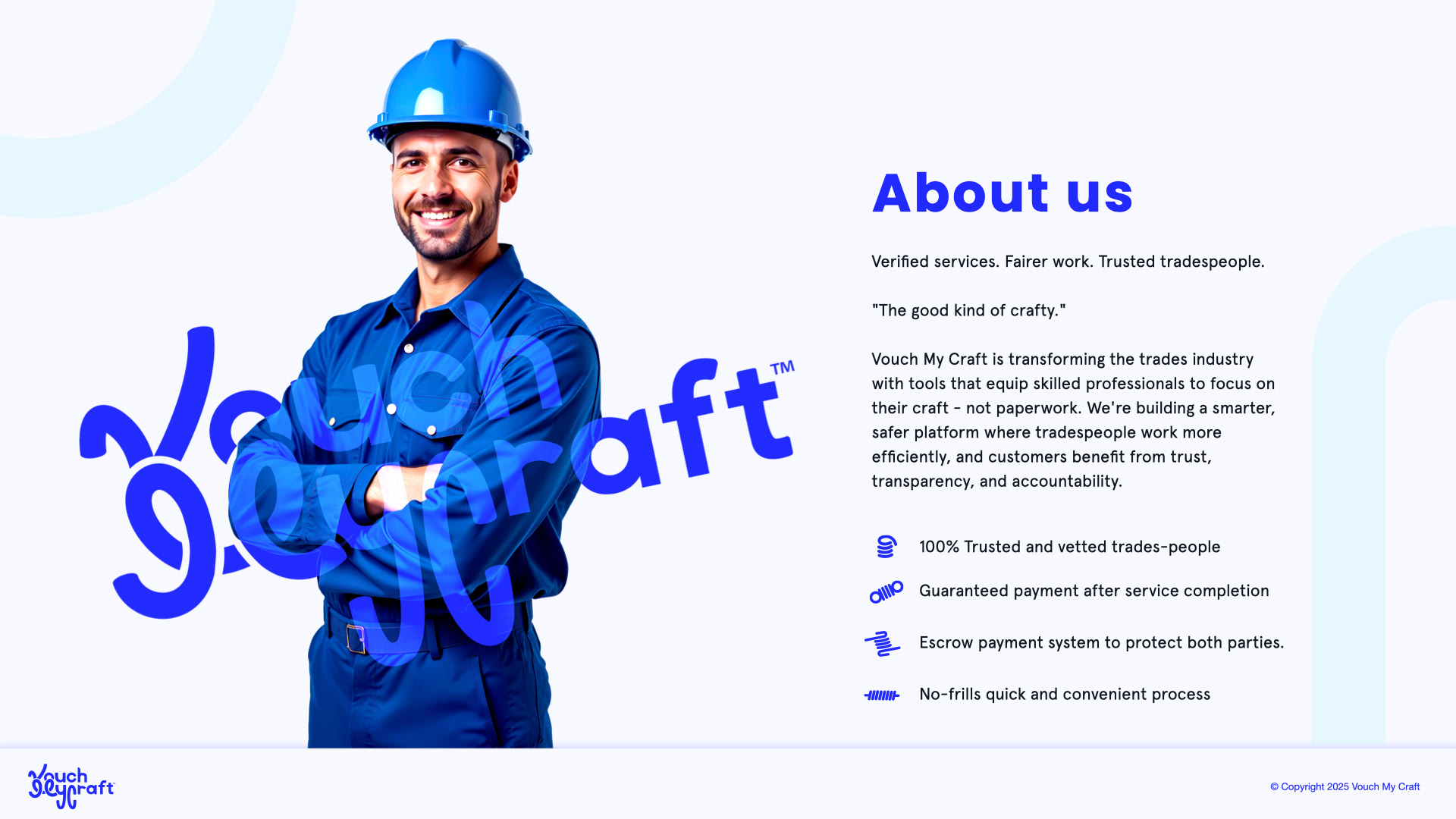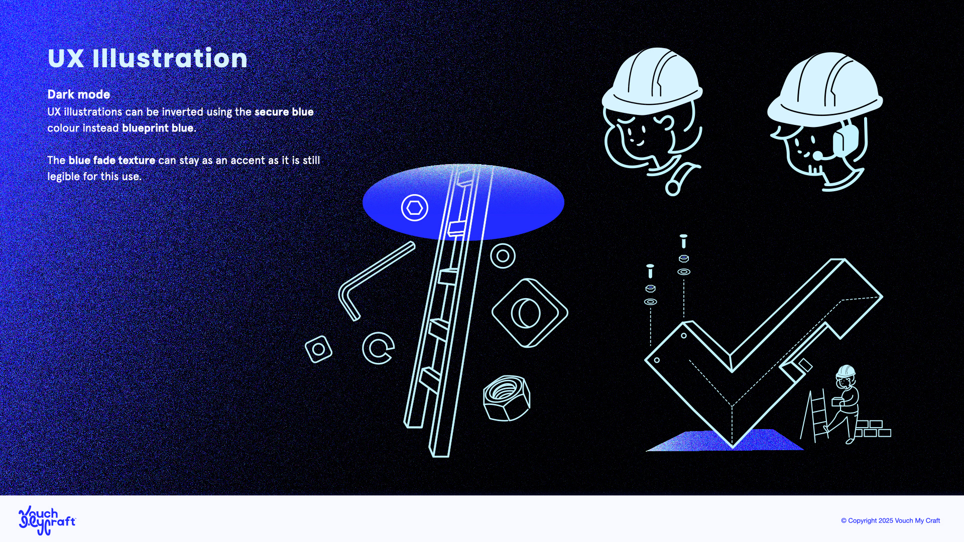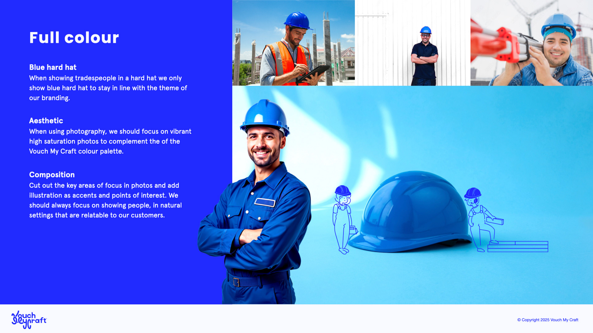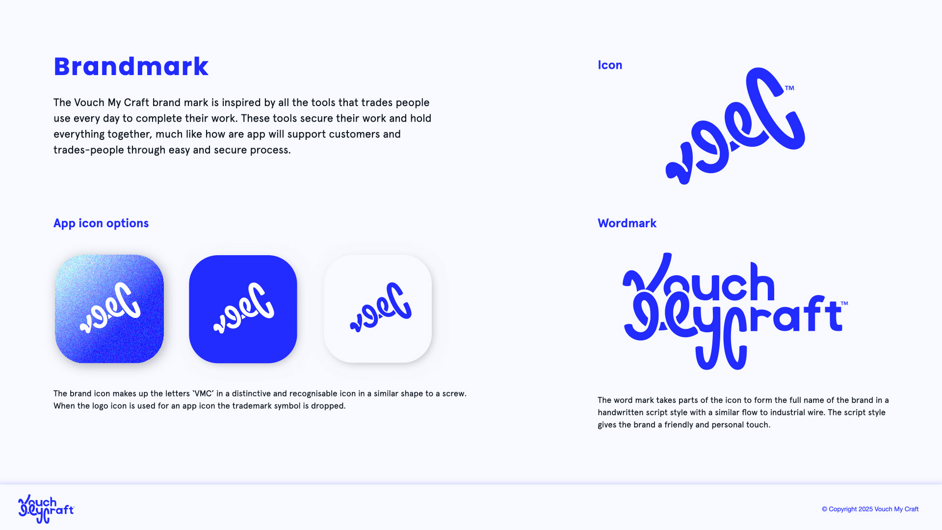 These are brand design guidelines for a new innovative tech start-up within the skilled trades/ home services market, called Vouch My Craft. The visual concept is inspired by turning screws, wire and nuts and bolts, symbolising the people within the industry as well as the 'do-it-yourself' nature of the product design.